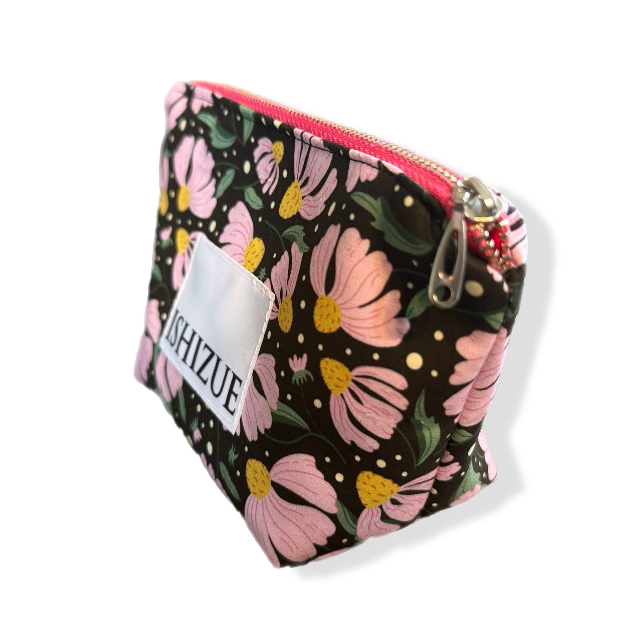大人女子に大人気の花柄ポーチが登場! 甘すぎないピンクとブラックのコントラストが、絶妙なバランスでおしゃれ度をアップしてくれます。 デザイン: ISHIZUE ロゴタグ付き カラー: ブラックベース(花柄:ピンク×イエロー) 形状: 収納力抜群のマチありタイプ 毎日のメイク直しや、旅行時の小物入れとしてぜひご活用ください! サイズ: 横幅(上部16cm・底部11cm)高さ10cm マチ7cm 素材: コットン/ 裏地 ナイロン 裏地の色: 黒
